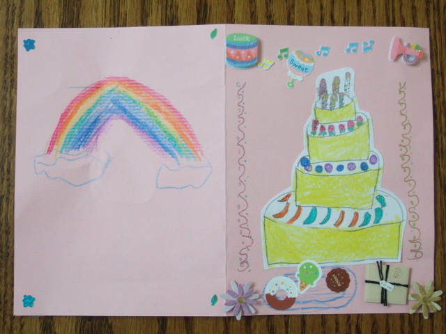 小羊要求我裁一張紙卡給她,又要求我要給她一顆「Happy Birthday」的印章及彩虹印台給她,更要求把我的「貼紙」都給她使用,好吧好吧!都隨便妳用吧,她就自己畫了個大蛋糕,再加上一些圖案,然後把很多造型貼紙都裝飾。哇!我自個兒也從來沒用那麼多貼紙,小羊一次用量就是好幾倍,不過看她用得很開心,後來就完成了這張生日賀卡啦。