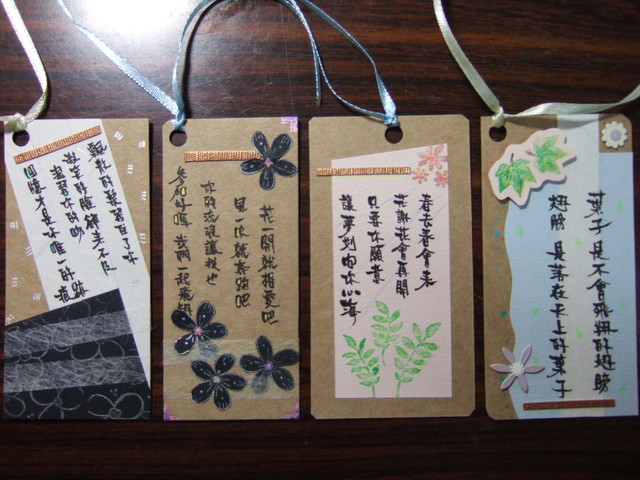 說起來這些不算是一系列的四張小書卡!但卻是一口氣做完的,完全是當下想到要放什麼元素就放上去,沒任何美學理論、也沒任何技法應用。當做完後,就思考要放什麼文字,想來想去,就用上頭的圖案,聯想可以引用哪些歌的歌詞,作為應景文字,是有點硬湊啦,真的說起來,就當作是試作品囉。